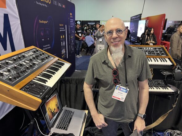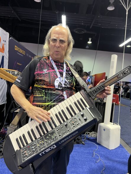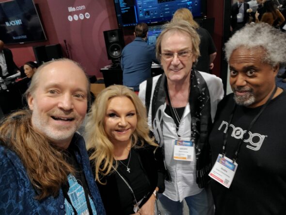 Andrew Coyler (left) (Circuline, Robert Berry), with legendary keyboardist Geoff Downes (ASIA, Yes, Buggles), his wife Martine, and lauded guitar and keyboard tech Andre Cholmondeley (We Are Ants to Them) in the ILIO booth, where Andrew was demonstrating Spectrasonics Bob Moog Tribute Library v2 for the Bob Moog Foundation.