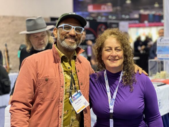 Bob Moog Foundation Executive Director, Michelle Moog-Koussa, with synthesist, composer, and professor King Britt.