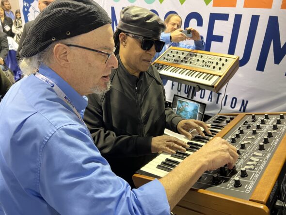 Bob Moog Foundation Online Education Coordinator and resident synth guru Lee Sebel showing Stevie Wonder the rare and wonderful Crumar Spirit.