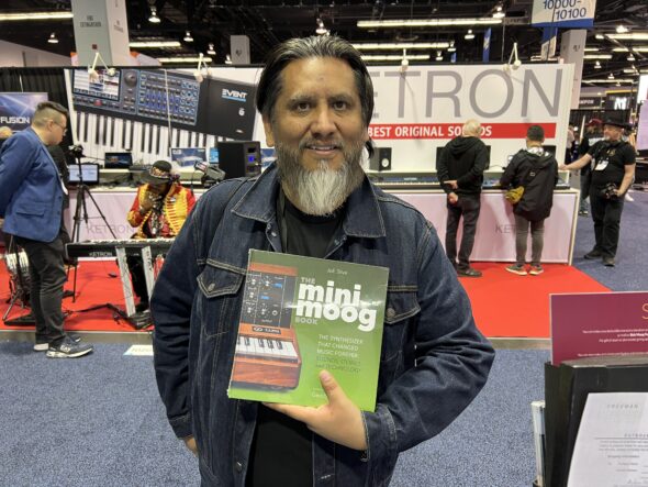 Erik Ribeiro picks up a copy of The Minimoog Book by Bjooks. The Bob Moog Foundation was honored to be featured heavily in this book.