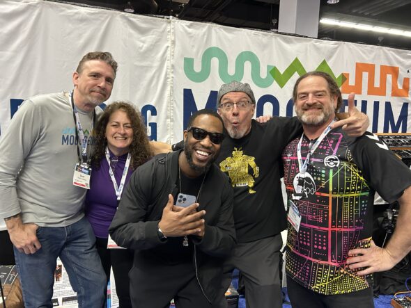 Bob Moog Foundation NAMM Team (from left to right) Dave Lovelace, Michelle Moog-Koussa, Lee Sebel, and Craig Frustaci with massively talented keyboardist extraordinaire Cory Henry (middle).