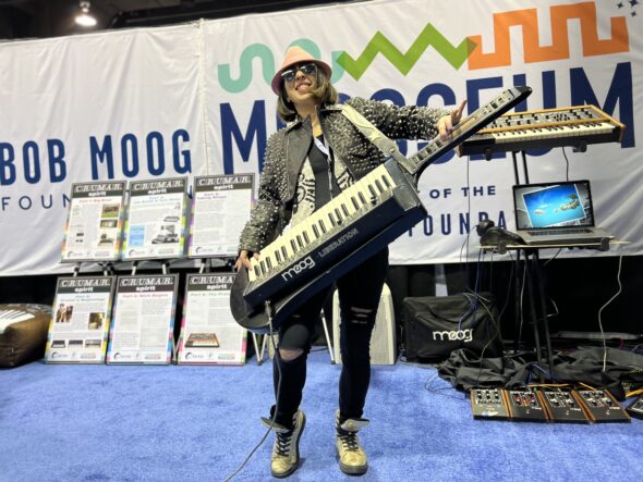 Keyboardist Emiko Carlin rocking a vintage Moog Liberation keytar from the Bob Moog Foundation Archives.